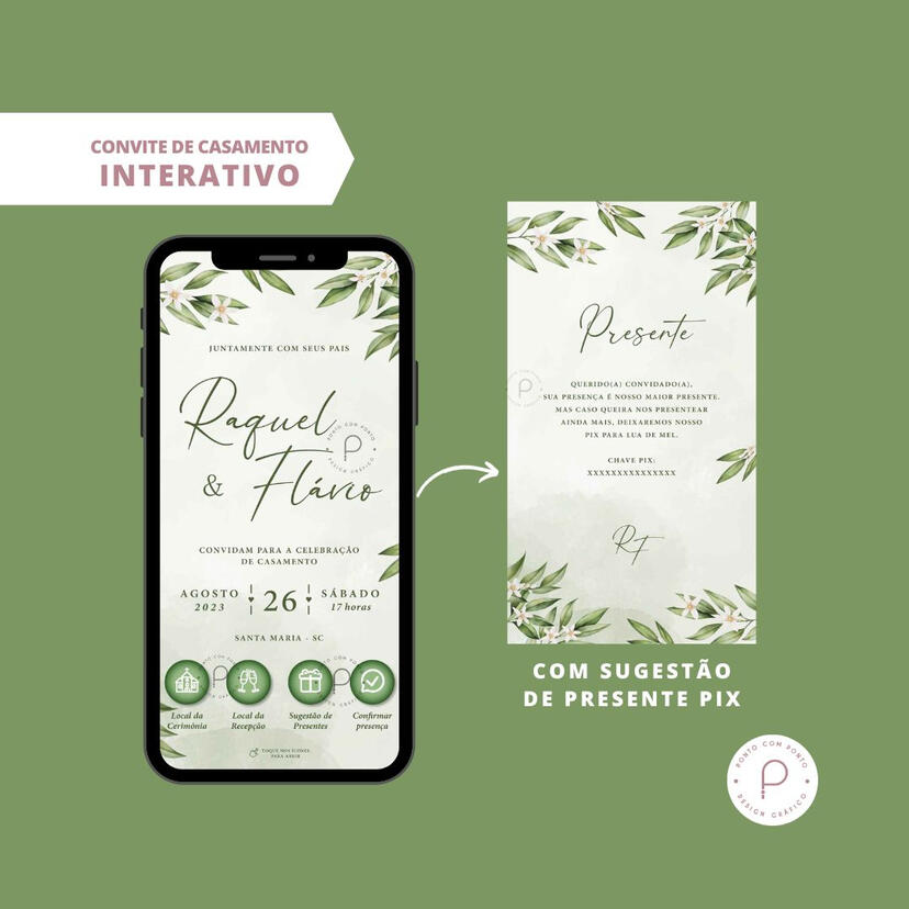 O convidado recebe o convite em PDF interativo e ao clicar nos ícones será redirecionado aos seus links: Sua lista de presentes virtual, confirmação de presença, site dos noivos (caso tenha) e a localização da cerimônia e recepção (link do Google Maps ou Waze), abrindo diretamente a rota.
