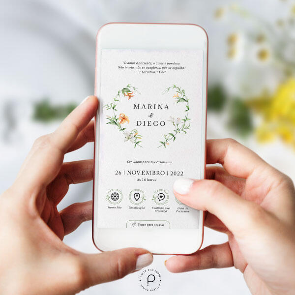Os convites interativos são 100% digitais, podem ser enviados diretamente para o WhatsApp do seu convidado. Você economiza, sem perder a elegância.